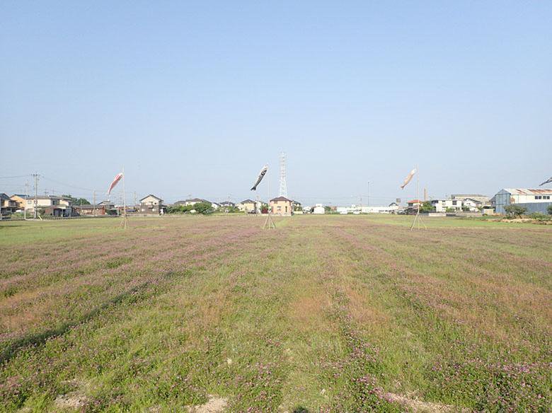 一宮市レンゲ畑の向こう側