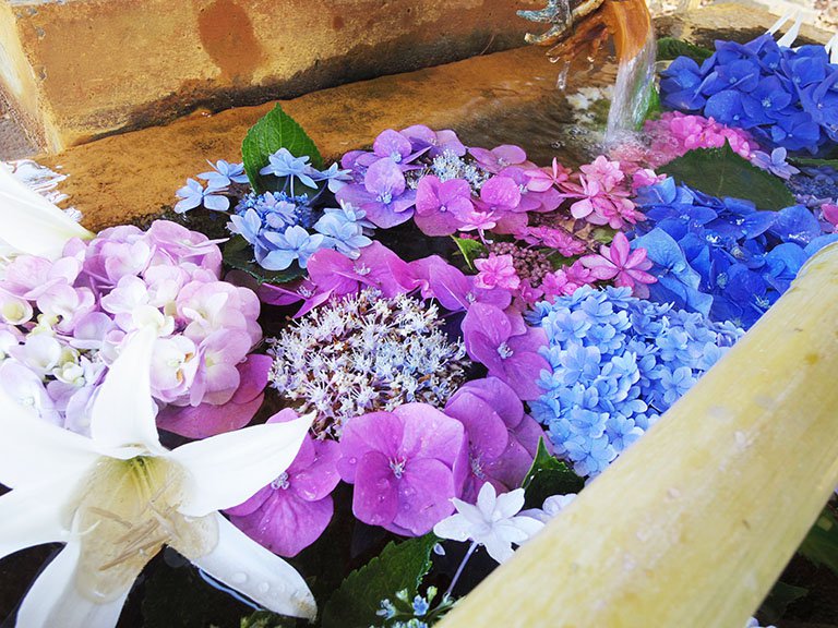 広い境内の一角に、こじんまりとある手水舎。紫陽花の他にもゆりが入れられています。 神社やお寺によって、少しずつ雰囲気が変わるのがいいですね。