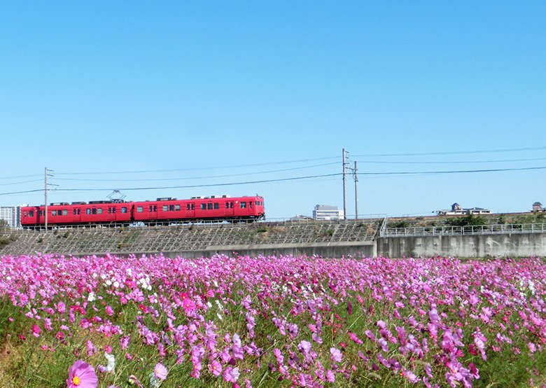 線路沿いにあるので、名鉄の赤い電車とコスモスを一緒に撮影できちゃいます!