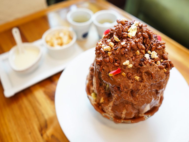 運ばれてくると、テンションが上がってしまうくらいのボリュームと、見た目! チョコレートソースがかかっていて、かなり濃厚な感じに見えますが、ふんわりとしたかき氷なのでひとりでも軽く食べられます。 嬉しいことに、練乳と昆布茶・おかきまでもついてきます。