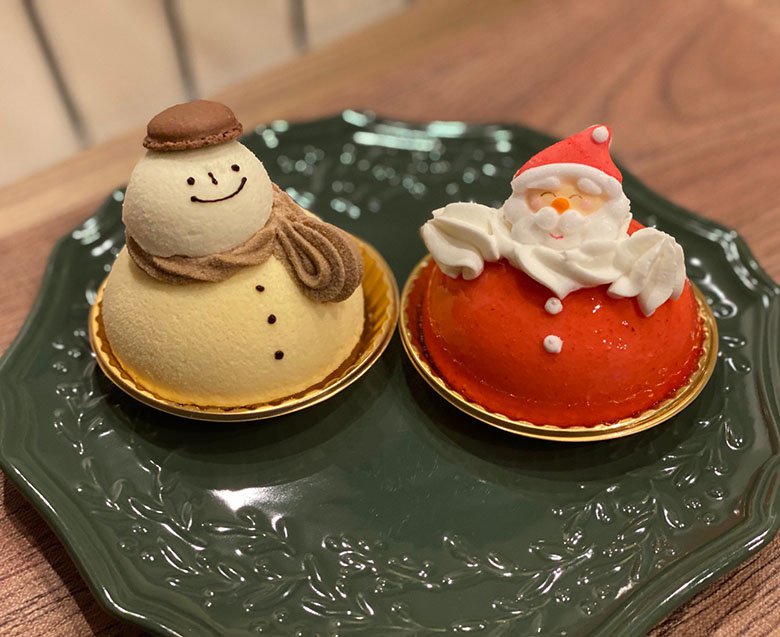 うしろにあるおうち型のケーキは「メゾン」。こちらは通年メニューだそうですが、クリスマス限定かなと思ったほど、スノーマン、サンタさんと並べると似合います♪