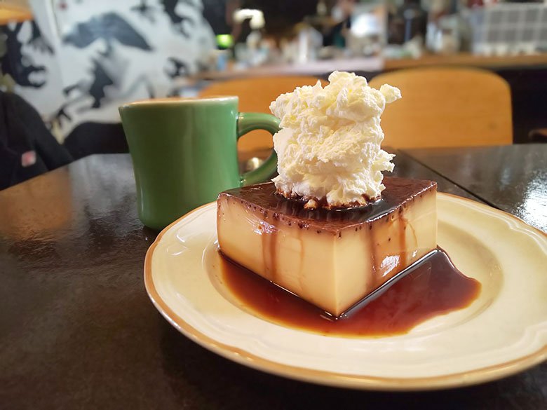 この時は飲み物をホットカフェラテにしたのですが、グリーンのカップが可愛い!そしてハートのラテアートまで! プリンもやっぱり美味しくて、しっかり量があるのに頼まなくては気が済みません。 平日はオープンの11:30~から注文可、土日は7:30~11:00がモーニングメニューのみになるので11:00以降でしたら注文できますよ。