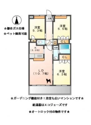敷 金30,000 / 礼 金2.00ヶ月間取り 3LDK / 69.23㎡入居日 2026年2月15日頃