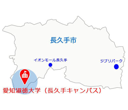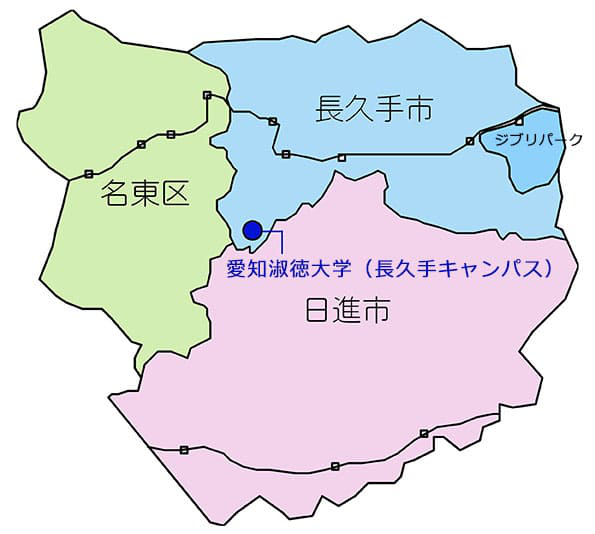 愛知淑徳大学(長久手キャンパス)は、長久手市の左下に位置し、名古屋市名東区、日進市と隣接しています。
