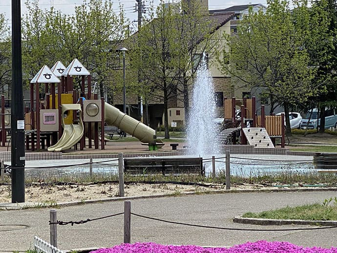 4月には芝桜、5月にはバラが見頃になるほか、予約の要らないデイキャンプ場や広い芝生、噴水での水遊びもできます。
