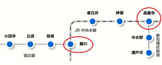 東海交通事業城北線「勝川駅」と愛知環状鉄道「高蔵寺駅」は、始発駅になるため、座って電車移動が可能です。