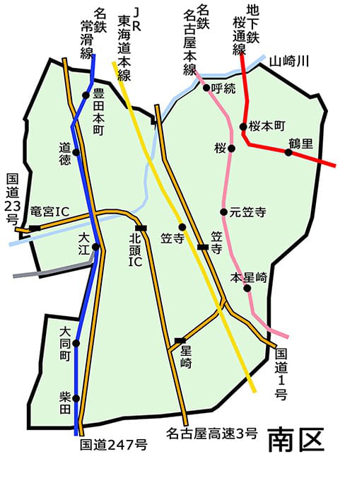 南区は、堀川・山崎川・天白川に挟まれた立地です。