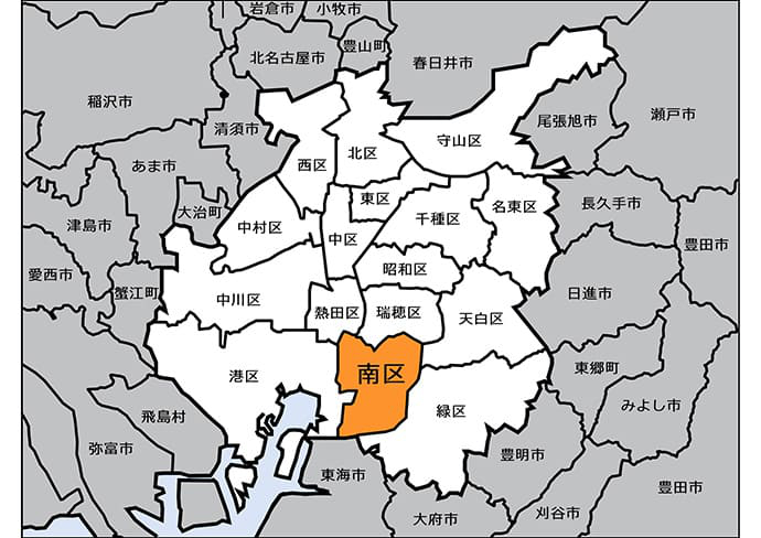 名古屋市南区は、名古屋市の南部に位置し、港区・熱田区・瑞穂区・天白区・緑区に囲まれています。