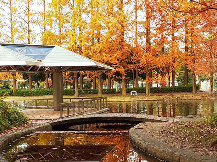 神宮東公園(じんぐうひがしこうえん)は、道路を挟んで南北に広がる横長な作りが特徴的な公園です。