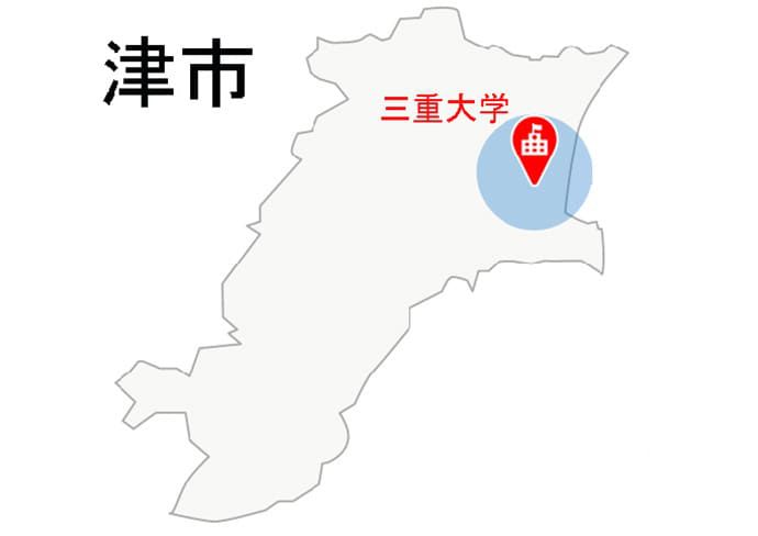 三重大学は、津市中心部から北東へ行った場所にあります。