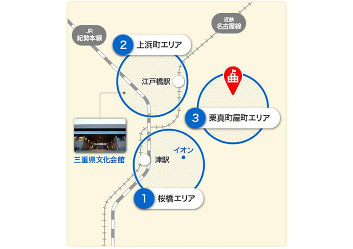 ここでは、三重大学の周辺を「桜橋エリア」「上浜町エリア」「栗真町屋町エリア」の3つに分け、ご紹介します。