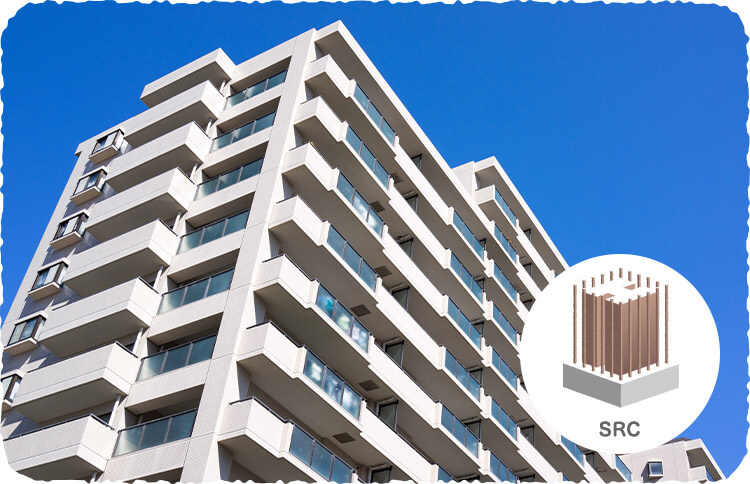 鉄筋鉄骨コンクリート(SRC)造はRC造の芯に鉄骨がさらに加わった、さらに強度が高まった構造です。鉄骨造のしなやかさとRC造の耐久性を併せ持っているのが特徴です。