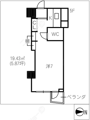 階数12階建/5階 面積19.43㎡(約5.87坪) 築年数築48年